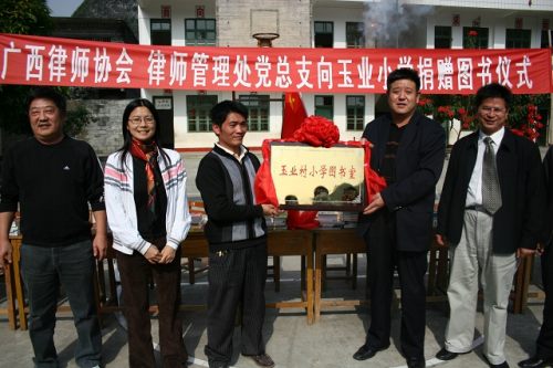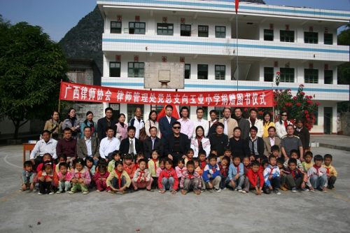 2008年11月21日,自治区律师协会、律师管理处党总支到马山县开展“学习实践科学发展观为社会主义新农村建设提供法律服务”主题实践活动,以“区直律师事务所与基层司法所结对子,援助基层法律服务工作,捐助山区贫困学生”为具体内容。这次活动在司法厅律管处处长李健、自治区律师协会秘书长严丽萍的组织带领下,律协、律管及区直律师事务所党支部和律师党员为玉业村小学“捐助图书资料室”款项达壹万壹千捌佰捌拾元人民币,律协、律管党总支将分批分次把书籍送到玉业村小学。此次活动一行30人参加,并得到了司法厅党委的大力支持,司法厅党委委员、政治部主任张君三同志应邀参加并指导本次活动。